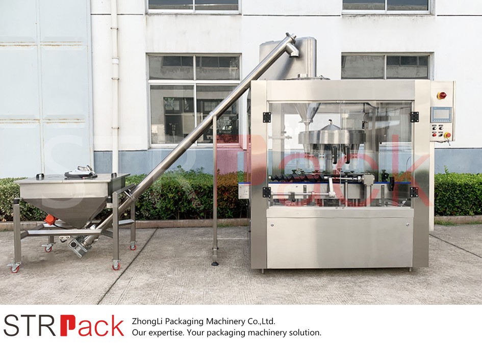 The STRPACK 12-head rotary powder filling machine is designed for high-speed and continuous filling of powders and fine granules into bottles.